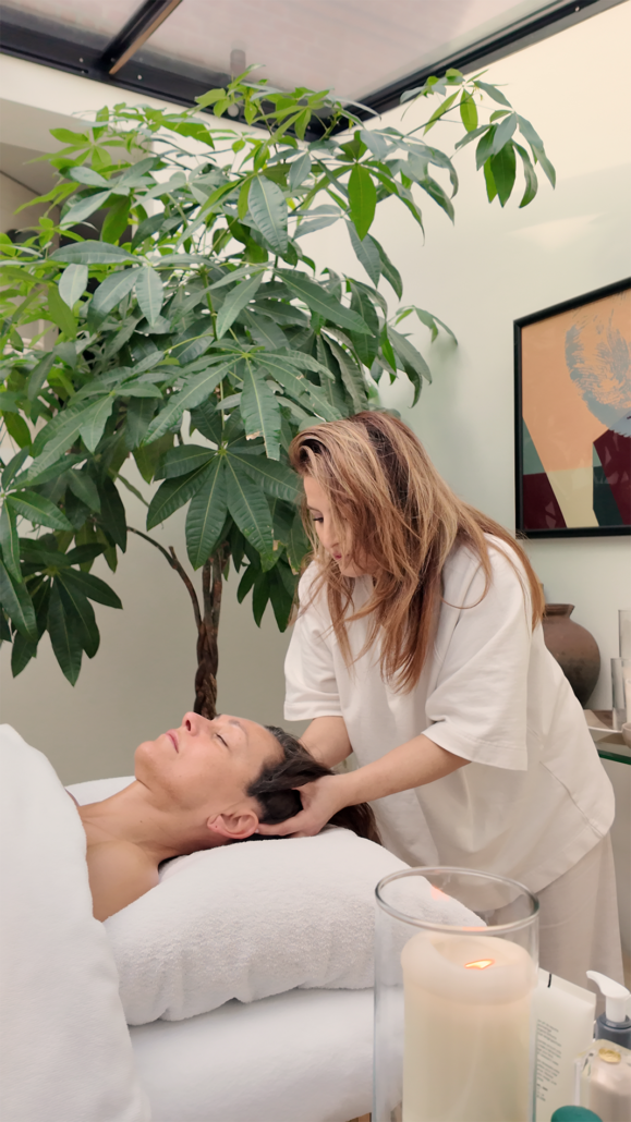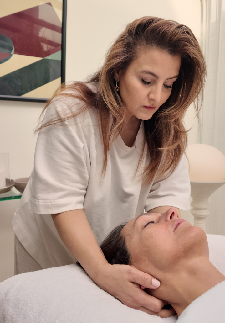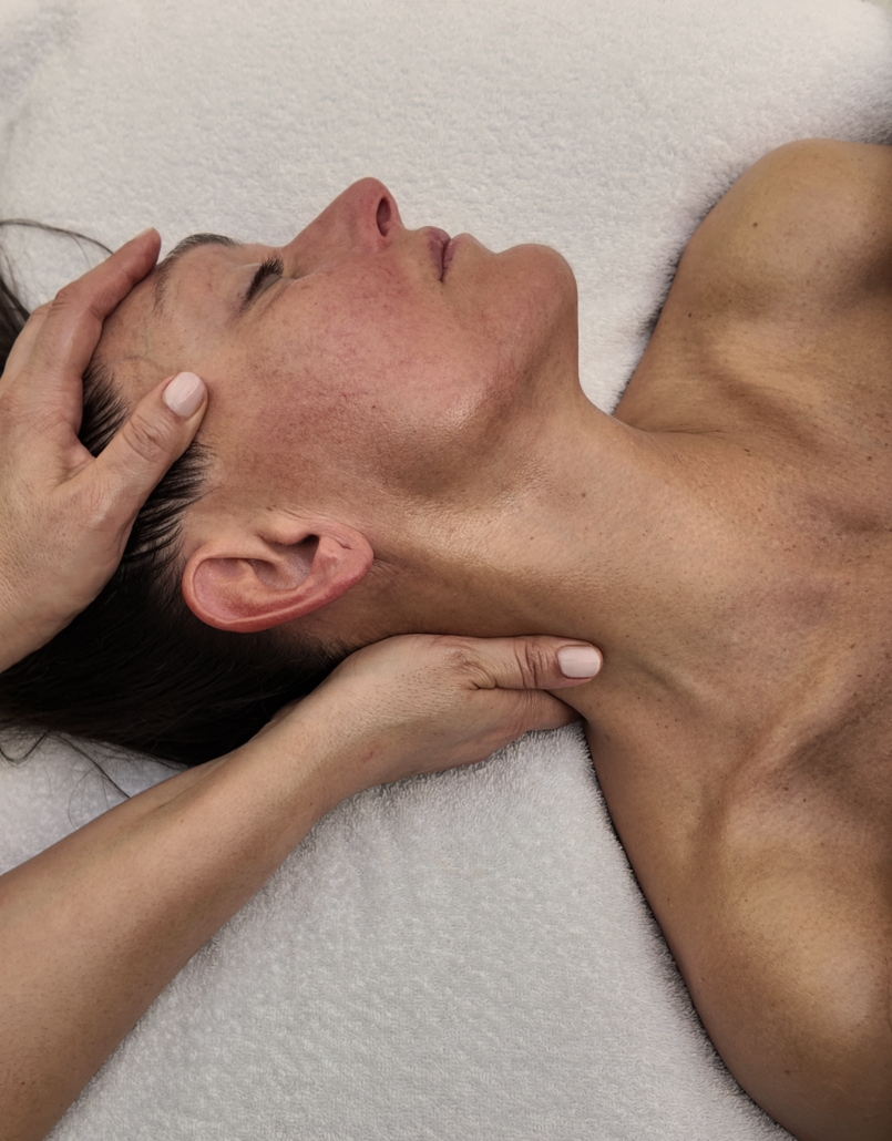 De behandeling begint met een zachte reiniging, gevolgd door langzame, ritmische aanrakingen die het zenuwstelsel helpen in een staat van rust en veiligheid te brengen. Lichte lymfatische technieken stimuleren de doorbloeding, verminderen vochtophoping en helpen oppervlakkige spanning in het gezicht en de kaak los te laten.
